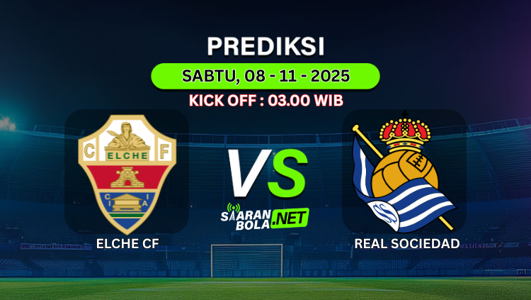 Prediksi PertandinganELCHE CF VS REAL SOCIEDADKick Off : Sabtu, 08 November 2025Pukul 03.00 WIB Prediksi Skor AkhirELCHE CF 1-2 REAL SOCIEDAD