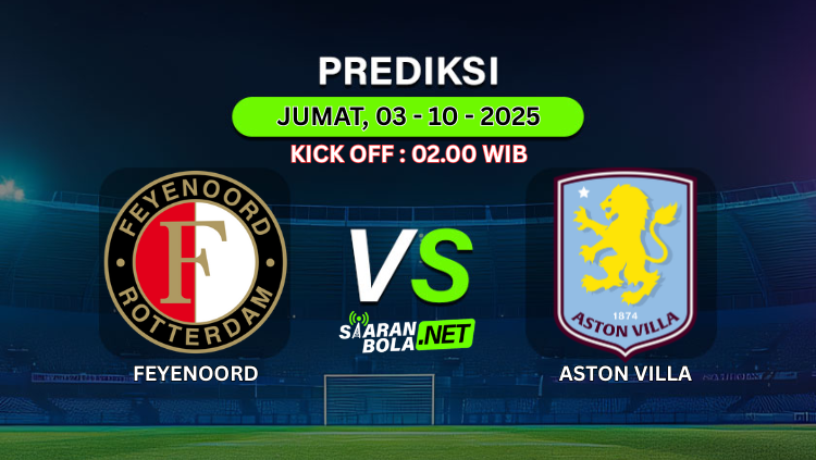 Prediksi PertandinganFEYENOORD VS ASTON VILLAKick Off : Jumat, 03 Oktober 2025Pukul 02.00 WIB Prediksi Skor AkhirFEYENOORD 1-2 ASTON VILLA