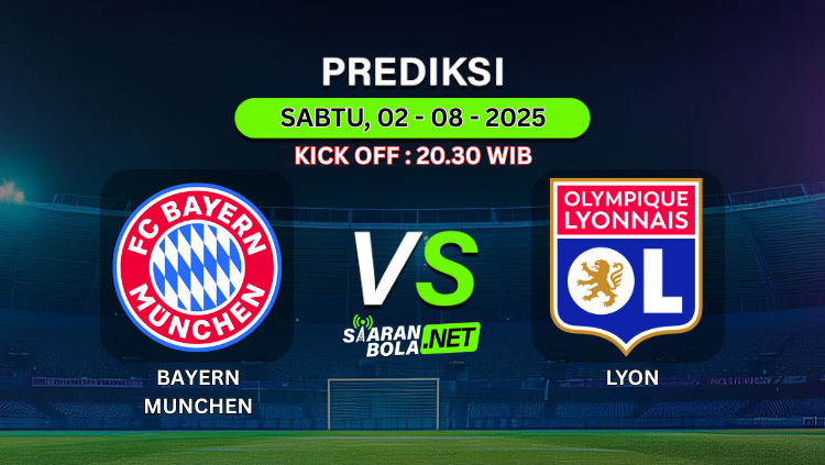 Prediksi PertandinganBAYERN MUNCHEN VS LYONKick Off : Sabtu, 02 Agustus 2025Pukul 20:30 WIB Prediksi Skor AkhirBAYERN MUNCHEN 3-2 LYON