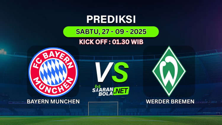 Prediksi PertandinganBAYERN MUNCHEN VS WERDER BREMENKick Off : Sabtu, 27 September 2025Pukul 01.30 WIB Prediksi Skor AkhirBAYERN MUNCHEN 3-0 WERDER BREMEN