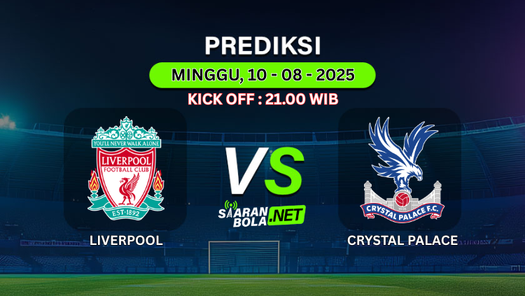 Prediksi PertandinganLIVERPOOL vs CRYSTAL PALACEKick Off : MINGGU, 10 Agustus 2025Pukul 21:00 WIB Prediksi Skor AkhirLIVERPOOL 2-1 CRYSTAL PALACE