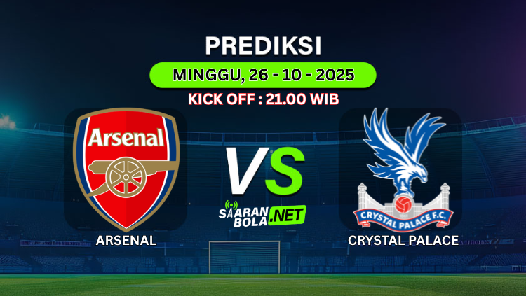 Prediksi PertandinganARSENAL VS CRYSTAL PALACEKick Off : Minggu, 26 Oktober 2025Pukul 21.00 WIB Prediksi Skor AkhirARSENAL 2-1 CRYSTAL PALACE